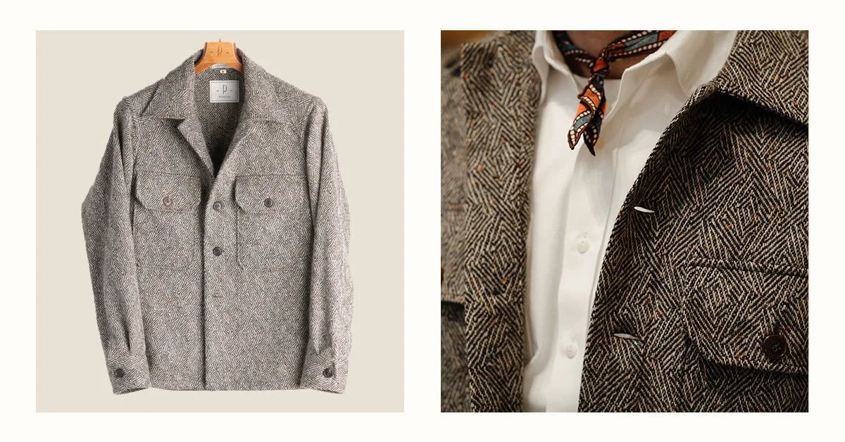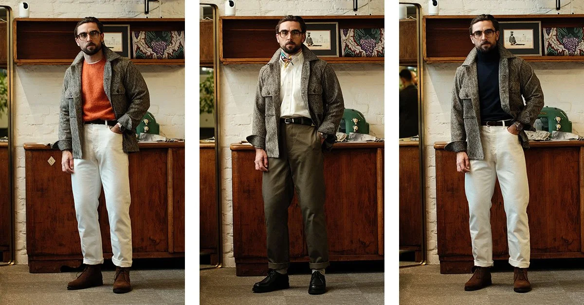 This is a piece I’ve been very interested in since I saw the preview of the collection, but I had mixed feelings about it. I really liked the Gamefeather Tweed pattern - it’s unusual and the little colorful details make it even more interesting and unique. But I wasn’t sure how I’d feel about tweed used in a more modern, shorter cut like this overshirt. When I think of tweed, I usually imagine a more traditional jacket or a hunting jacket, so I was afraid it might look too modern in a shorter style. All of this changed when I tried it on. I really like how this overshirt fits and feels in this fabric. But, I also have to point out that how you pair it makes a big difference. It can definitely look timeless when worn with the right fit - trousers with a higher rise, a tucked-in shirt or a sweater that sits around the natural waist. But it can also look very modern or even trendy if you pair it with trousers that have a lower rise or a very long sweater, so it’s something to keep in mind. Yet this overshirt turned out great. It creates a perfect contrast when worn with white jeans - again, my favorite combination, especially when paired with a colorful Shetland sweater, in my case, their orange version. It will also work with blue or indigo jeans, almost any neutral shade of wool trousers, classic chinos and even olive military trousers, as shown below.