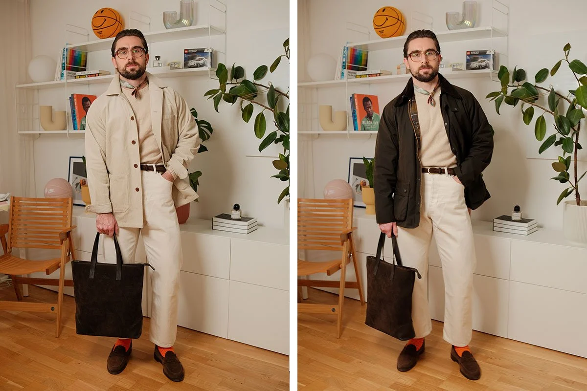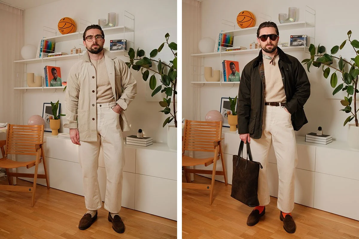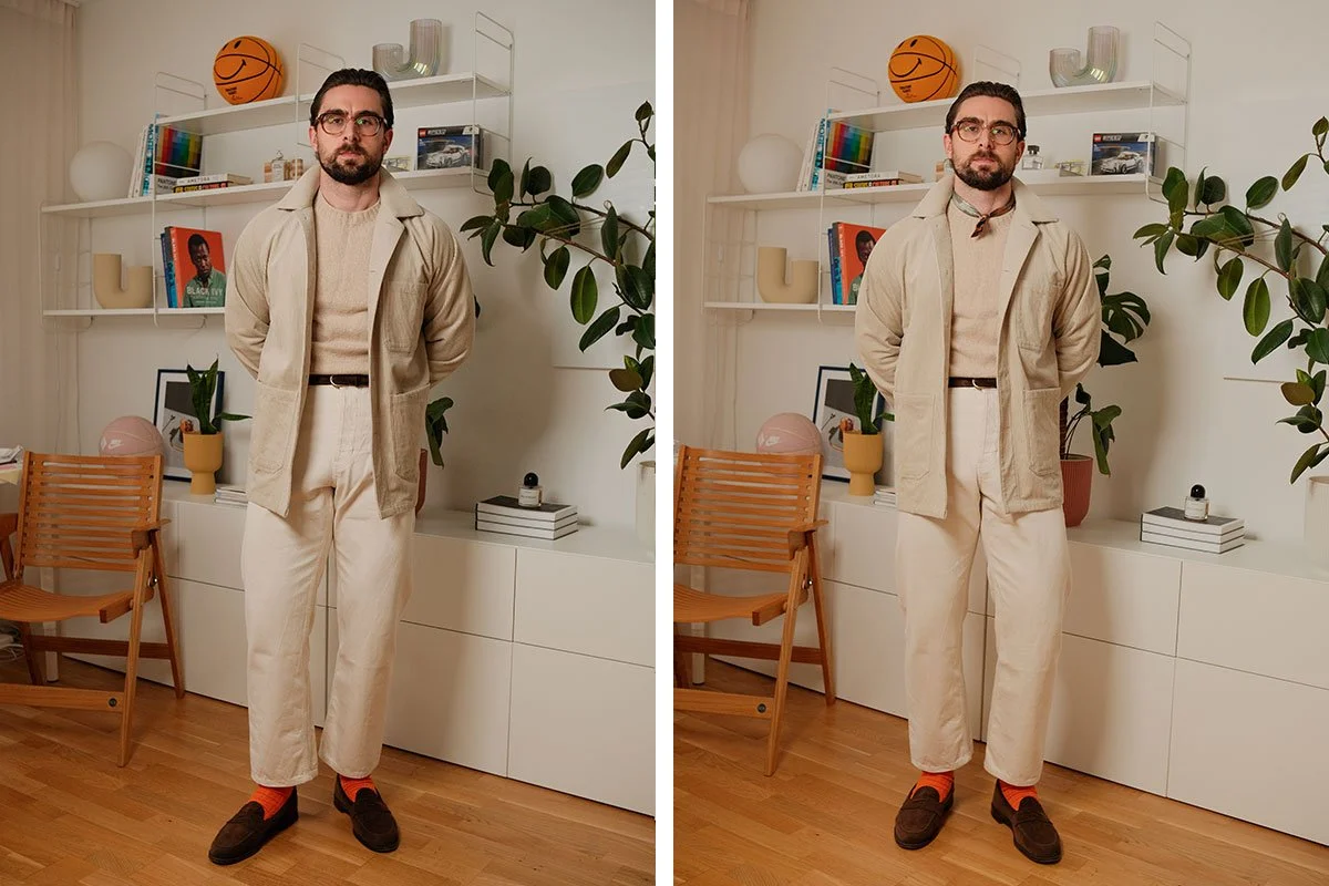 The visual difference between an outfit without a jacket and an outfit with a jacket.