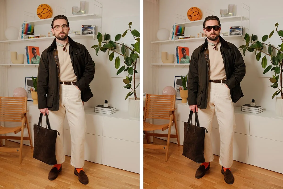 The visual difference between an outfit without a dark sunglasses and an outfit with sunglasses.