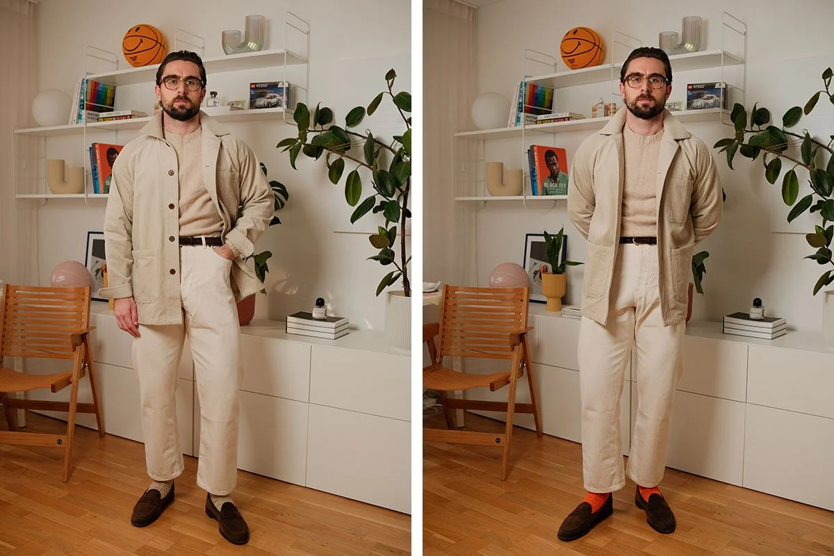 The visual difference between an outfit with neutral socks and an outfit with colorful socks.