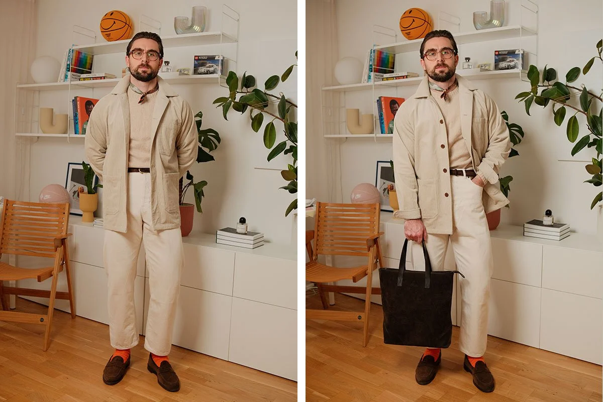 The visual difference between an outfit without a bag and an outfit with a bag.