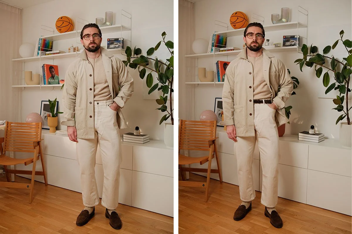 The visual difference between an outfit without a belt and an outfit with a belt.
