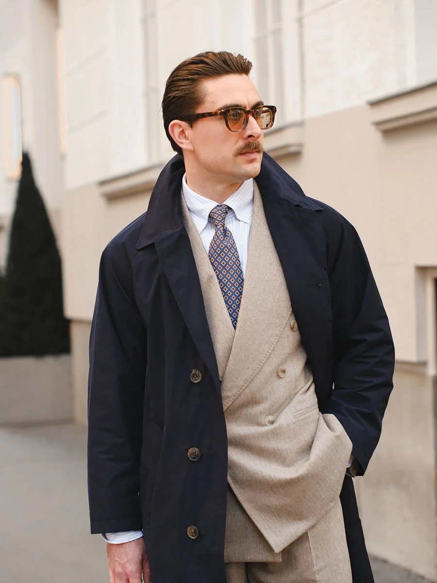 Even thought you will almost certainly be carrying an umbrella on such day, you should take a jacket that will provide you some extra protection. A trench coat or a mac coat are the best options (check out the best ones here), since they are longer and will protect most of your trousers as well. Another option is a waxed jacket, like the classic Barbour jackets (check out the best alternatives here), but these will leave most of your trousers exposed. You shouldn’t be concerned about the layers you wear underneath the outerwear, they will be well protected. But you should think about trousers, since they will almost certainly catch some drops of water and possibly some dust, salt, sand or dirt with it. So if you don’t want to worry too much about stains, or looking dirty when they dry, I suggest picking dark trouser - so navy, dark grey, brown or olive. Indigo jeans is the best option if you want to go more casual.