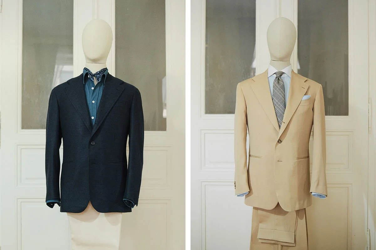 Outfit on the right: ‘MAX’ suit in vintage wool gabardine: 2600€, ‘Fileus’ shirt in Thomas Mason poplin stripe with contrast collar: 240€, Tie: Milan’s own, ‘Paolo Albizatti’ pocket square: 68€
