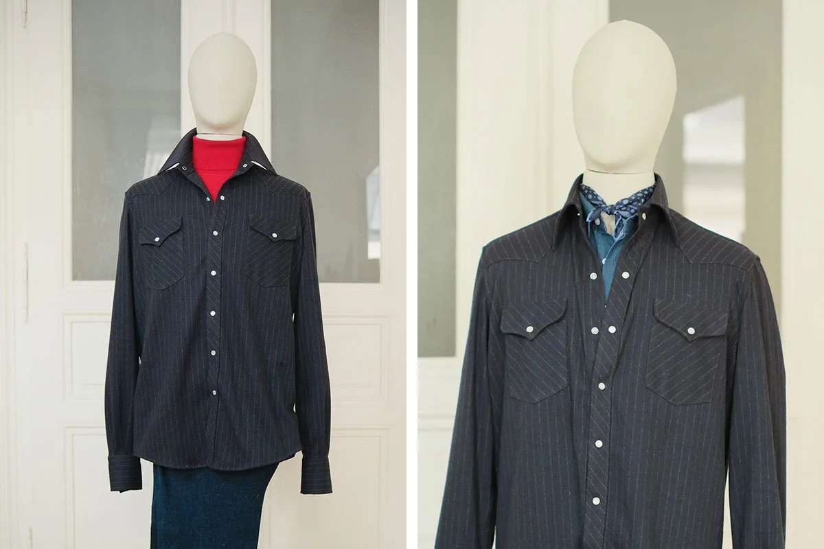 Outfit on the right: ‘MAX’ wool jersey Western shirt: 600€, ‘Fileus’ dark denim shirt with spearpoint collar: 190€, Cream colored denim in cotton/Tencel mix: 280€, ‘Paolo Albizzati’ pocket square as foulard: 68€