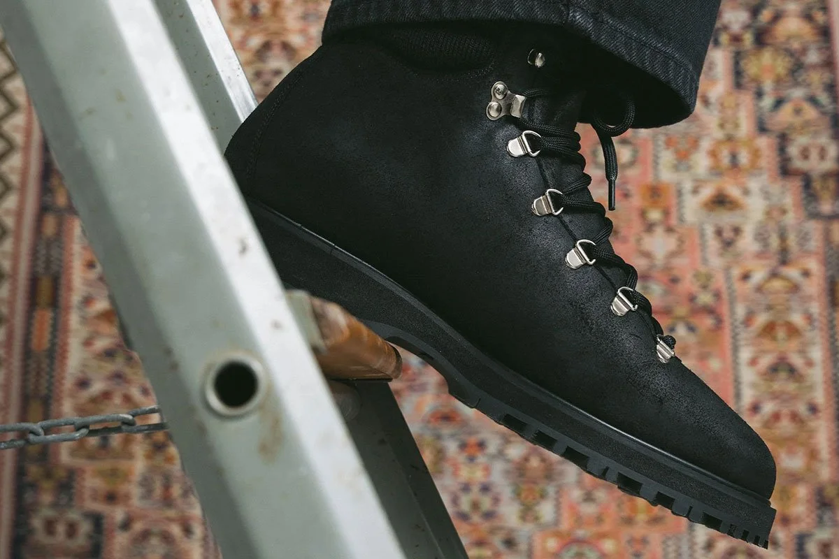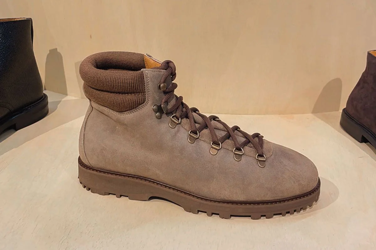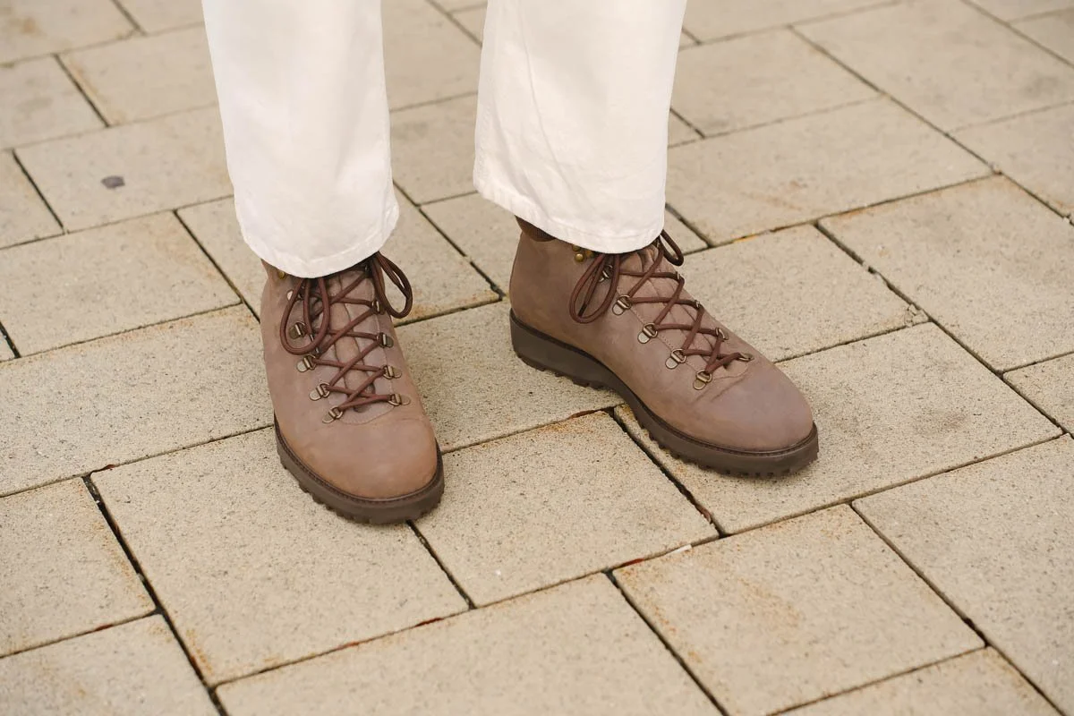 I went through all the traditional footwear brands, but also those who specialise in hiking, and made a list of the best options available. Some pairs on this list are better quality than others, but since I knew I would mostly wear them in the city, I decided to pick the ones whose style I like most. Most hiking boots come only in very dark colors, so I didn’t have too many options, and the lightest was the Myrqvist Duved boot in taupe waxed suede. The official photos didn’t really convince me - the boots seemed too wide and a bit bulky, so I was afraid they might not work for me, since I have slightly wider feet. Fast forward a few weeks to Pitti Uomo, where I went to check out the Myrqvist booth and I saw them in person for the first time. I was immediately sold - there they were, properly laced, and the shape looked great - they are really sleek for a hiking boot.