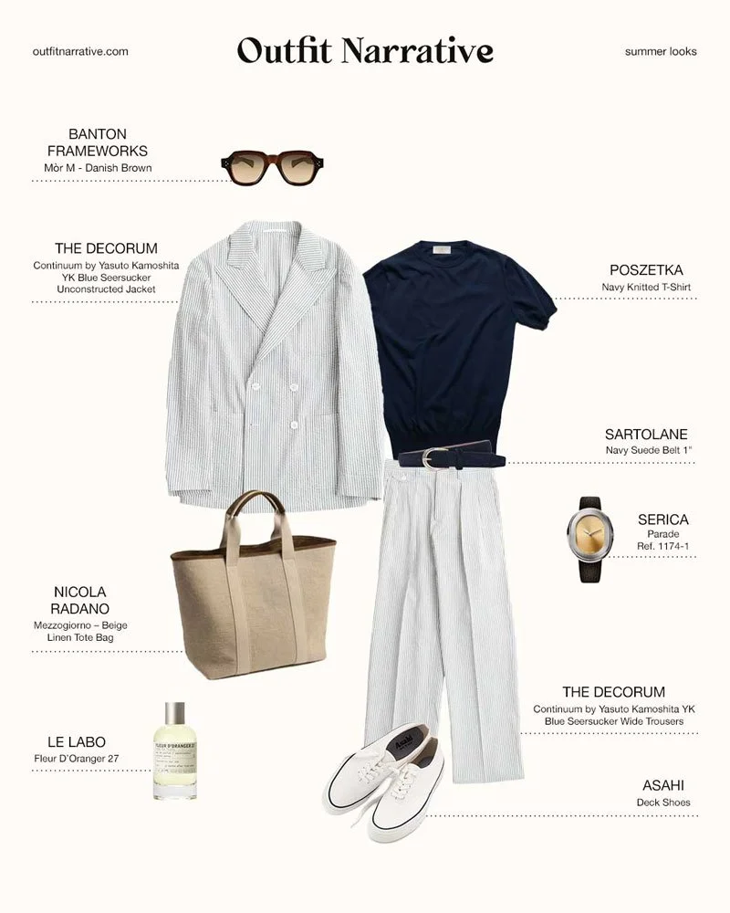 This will probably be the piece you wear the least, but it’s also the one that makes the biggest difference to the whole outfit. A must-have is a navy blazer, and I’d say the second option should be a white linen jacket. After that, you have plenty of options if you want more variety. If you’re looking for something very casual, a washed blue denim jacket is a great choice, and it can be considered as a light blue option. Or, if you want a very relaxed summer suit, go with a white and blue striped seersucker, which you can also wear separately (the same goes for navy and white). After that, it really comes down to your personal preferences and style. You could go for a pinstripe, houndstooth, or even glen check in blue or navy. Or try off-white or ivory if you prefer warmer tones. If you want something that really stands out, a solid light blue jacket is always an option.