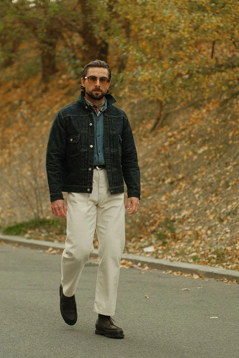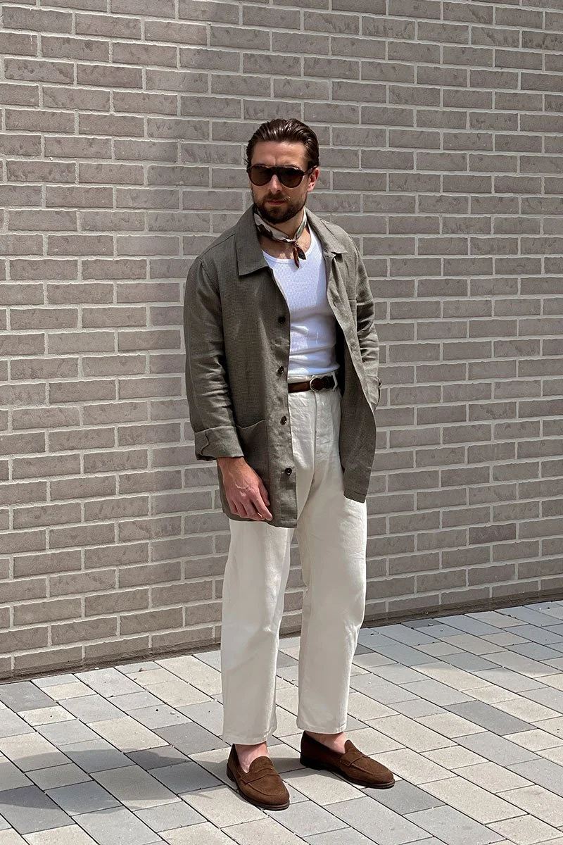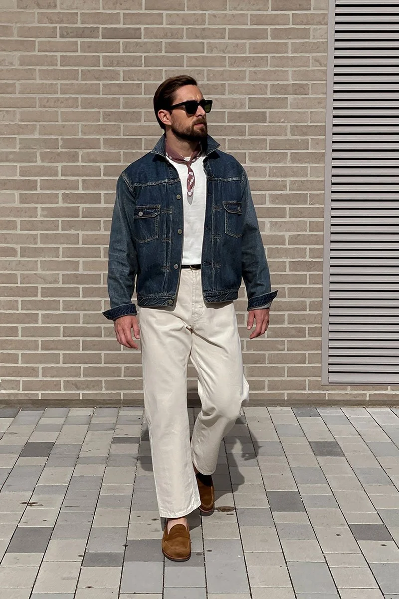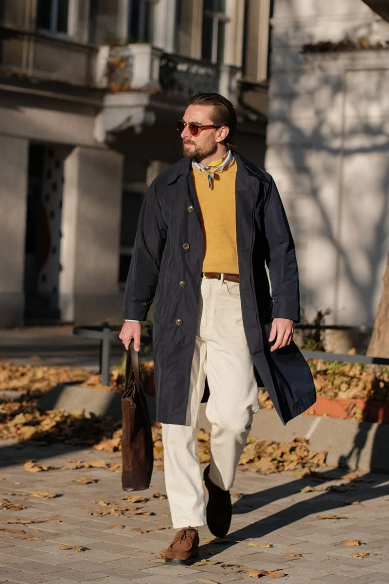 If you prefer to keep your outfits mostly neutral (beige, white, navy, gray, black), then you can add just one pop of color to make it more interesting. This prevents the outfit from looking too busy while still allowing for a bold or standout element. Add one piece in a brighter or richer color - like socks, a sweater, a bandana, or a hat. For example, ecru trousers and a navy jacket with a yellow sweater or socks.