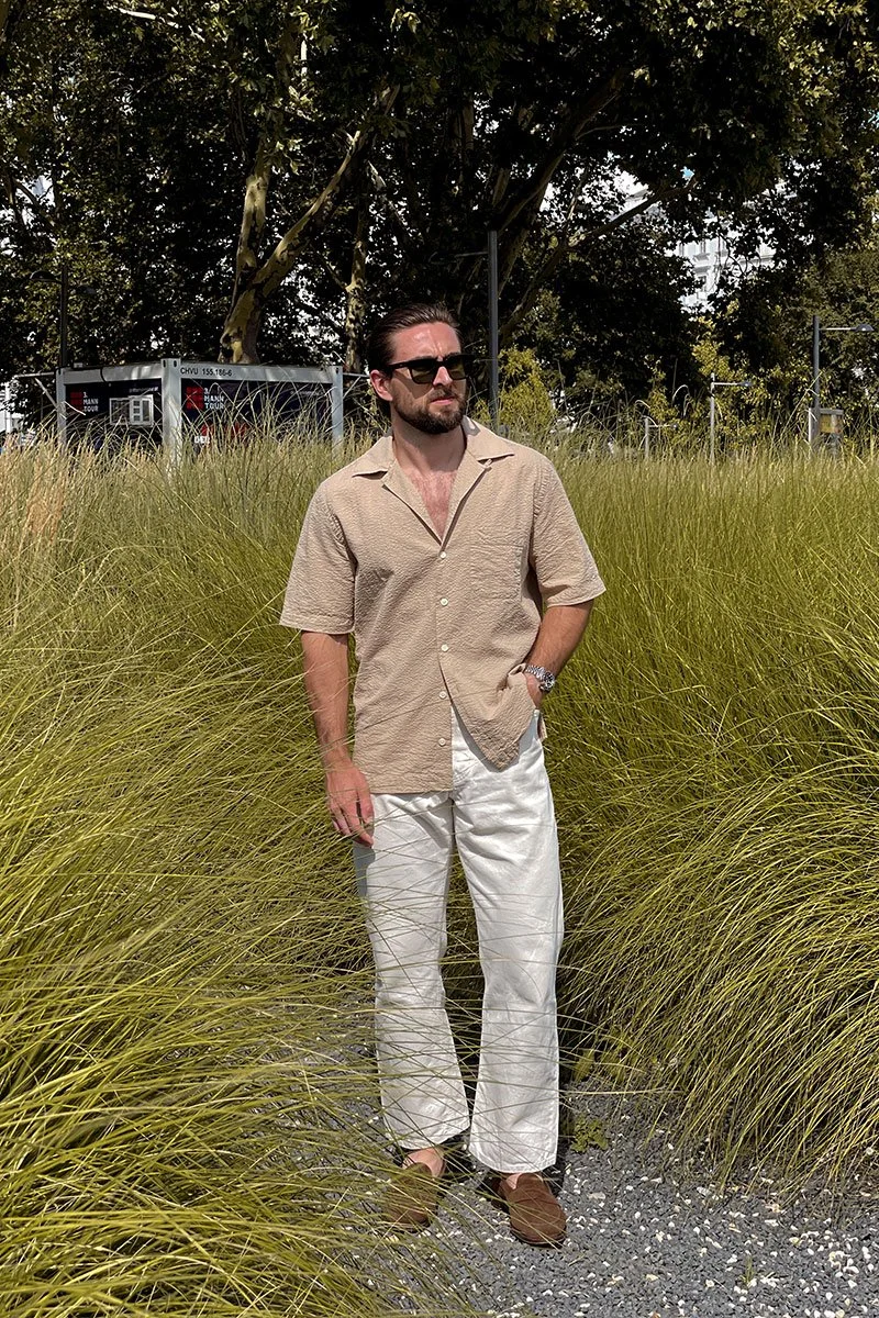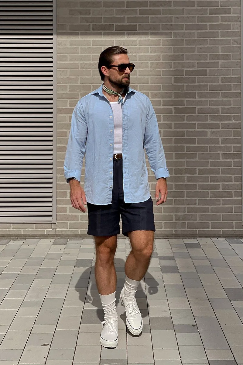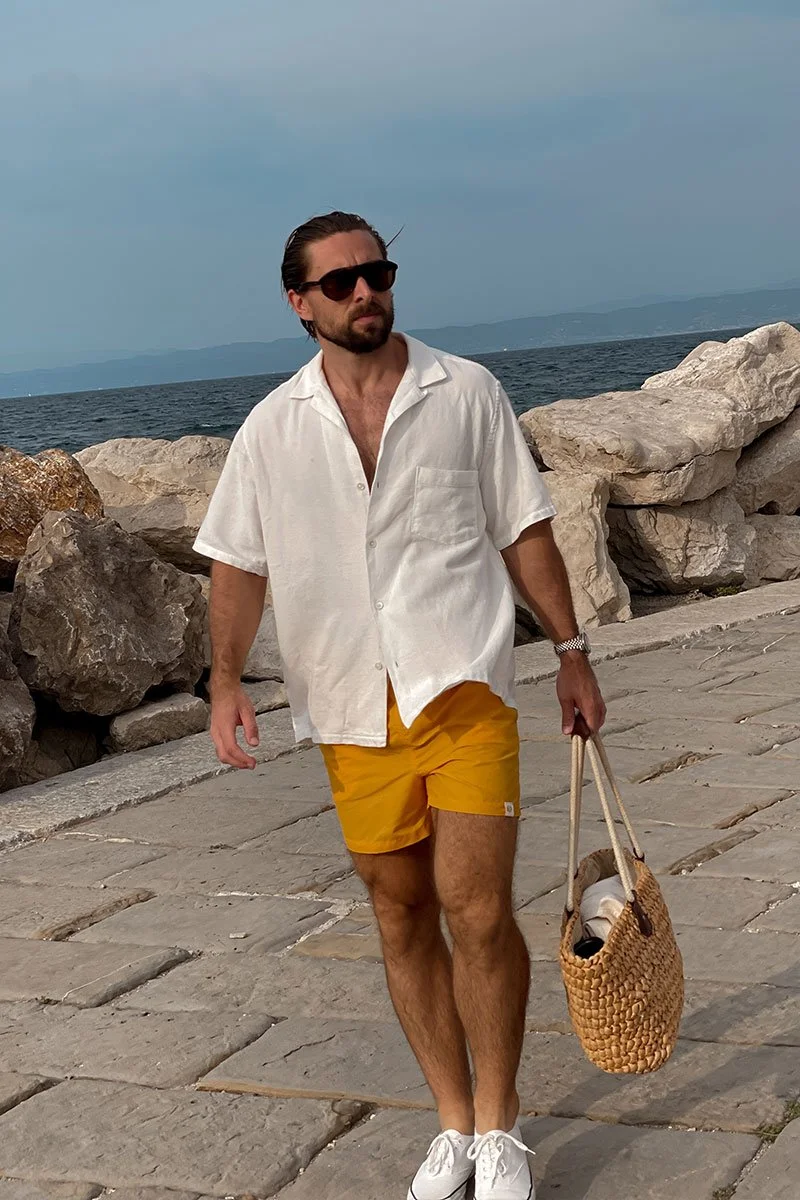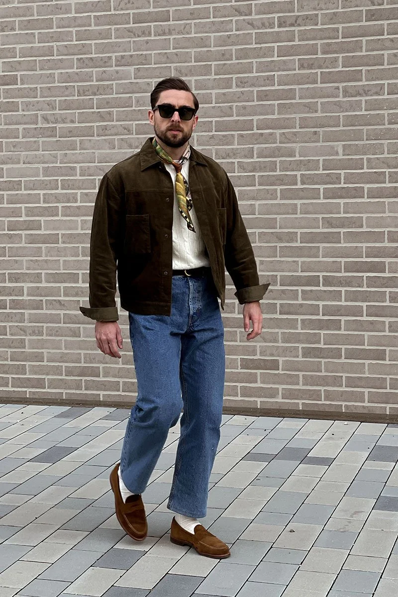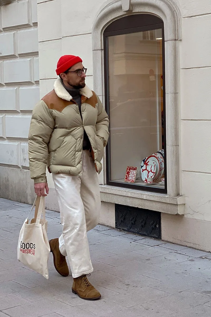 If you prefer to keep your outfits mostly neutral (beige, white, navy, gray, black), then you can add just one pop of color to make it more interesting. This prevents the outfit from looking too busy while still allowing for a bold or standout element. Add one piece in a brighter or richer color - like socks, a sweater, a bandana, or a hat. For example, ecru trousers and a navy jacket with a yellow sweater or socks.
