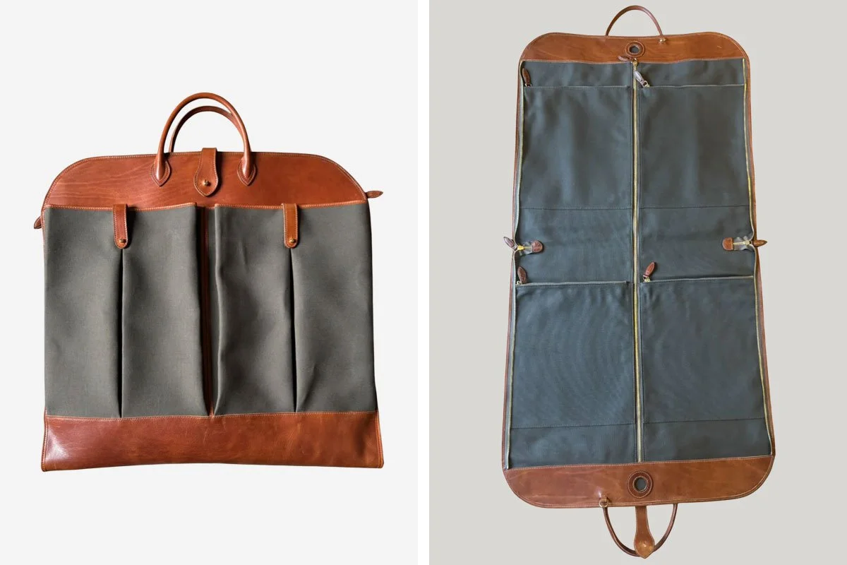 Nevertheless, this Suitbag from Peplord is special, not only in its aesthetics (his signature Tuscan leather paired with heavy cotton canvas) but especially in its functionality. It has two larger outer pockets where you can pack a lot of extra stuff, but it also has four internal zipped pockets, which is a very unique feature that I haven’t seen on any suit carrier before. So I believe technically this Suitbag can replace a weekender - you can pack your underwear and tees, plus other accessories and an extra pair of shoes in the four internal zipped pockets, while packing your main outfits with an extra jacket inside, and you still have two external pockets left. You would only have to carry an extra sleeve for a laptop, but if you wanted to solve that problem, I think you could fit it at the bottom of the Suitbag.