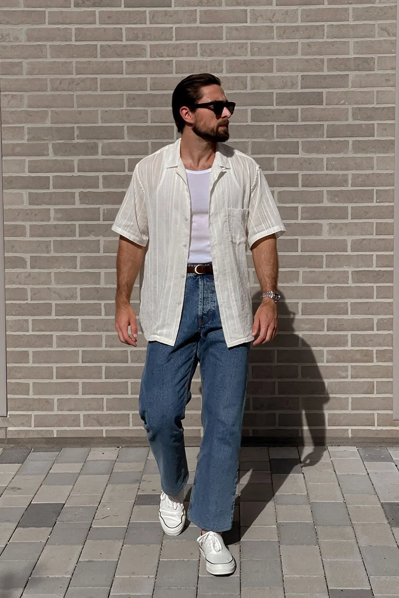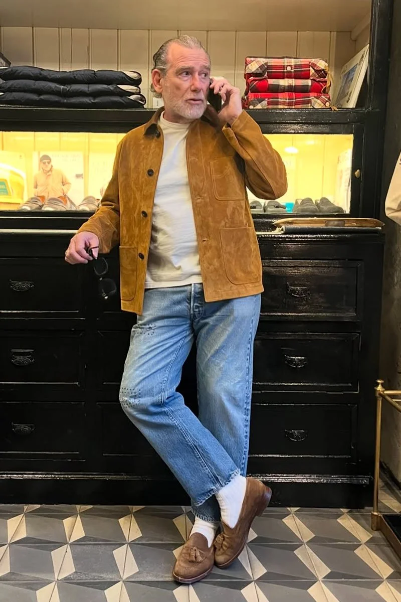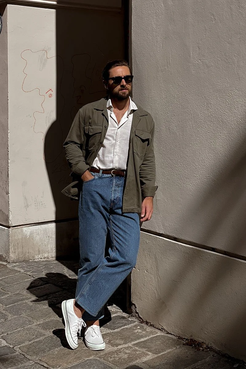 For more casual options, most jacket styles will work in almost any color. Still, I would personally avoid non-denim jackets in a shade of blue that’s too close to the jeans or anything in black, with the only exception being a leather jacket. It’s hard to find a combination cooler than a white tee, washed blue jeans, and a black leather rider jacket - such a classic look! Unfortunately, this combination doesn’t really work for my body type. But luckily, I think there’s another look that’s just as cool and classic: washed blue jeans paired with olive military jacket or overshirt. Again, it’s almost impossible not to look cool in this combination. Other jacket styles that work really well are brown suede jackets, waxed jackets, and overcoats (trench coats most of the year and wool overcoats in winter), but also down jackets and parkas in winter. The last option is the “Canadian Tuxedo,” which is when you pair jeans with a denim jacket, but make sure it’s the same wash. In my opinion, this is the only way it can work.