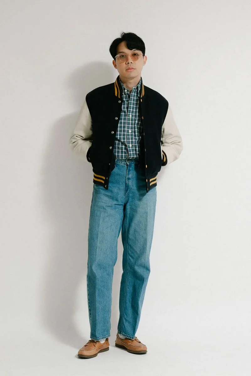 In this article, I will not go into detail about the differences between washing processes, like stone washing or bleaching, but it’s important to understand that there are many different shades of blue washes, from very light to very dark. This is often referred to as one-wash, one-year wash, two-year wash, and so on. The “more years you add”, the more washed the denim is, meaning the lighter the shade of blue. The main thing I want to point out is the difference in appeal between an evenly washed look and a “faded” or very worn-in look (when the area around the knees is much more washed out than the rest of the jeans). The first has cleaner, more elegant appeal, which makes it more suitable for tailoring but it still works well with everything else. While the faded versions have a more rugged appeal that works really well with workwear, military jackets, or a leather jacket, I don’t think they look good with a sport coat.