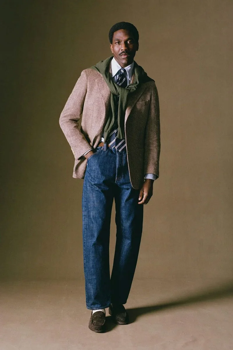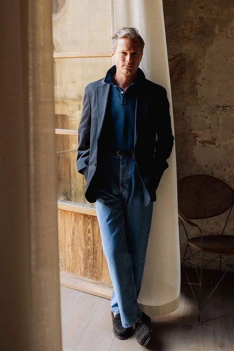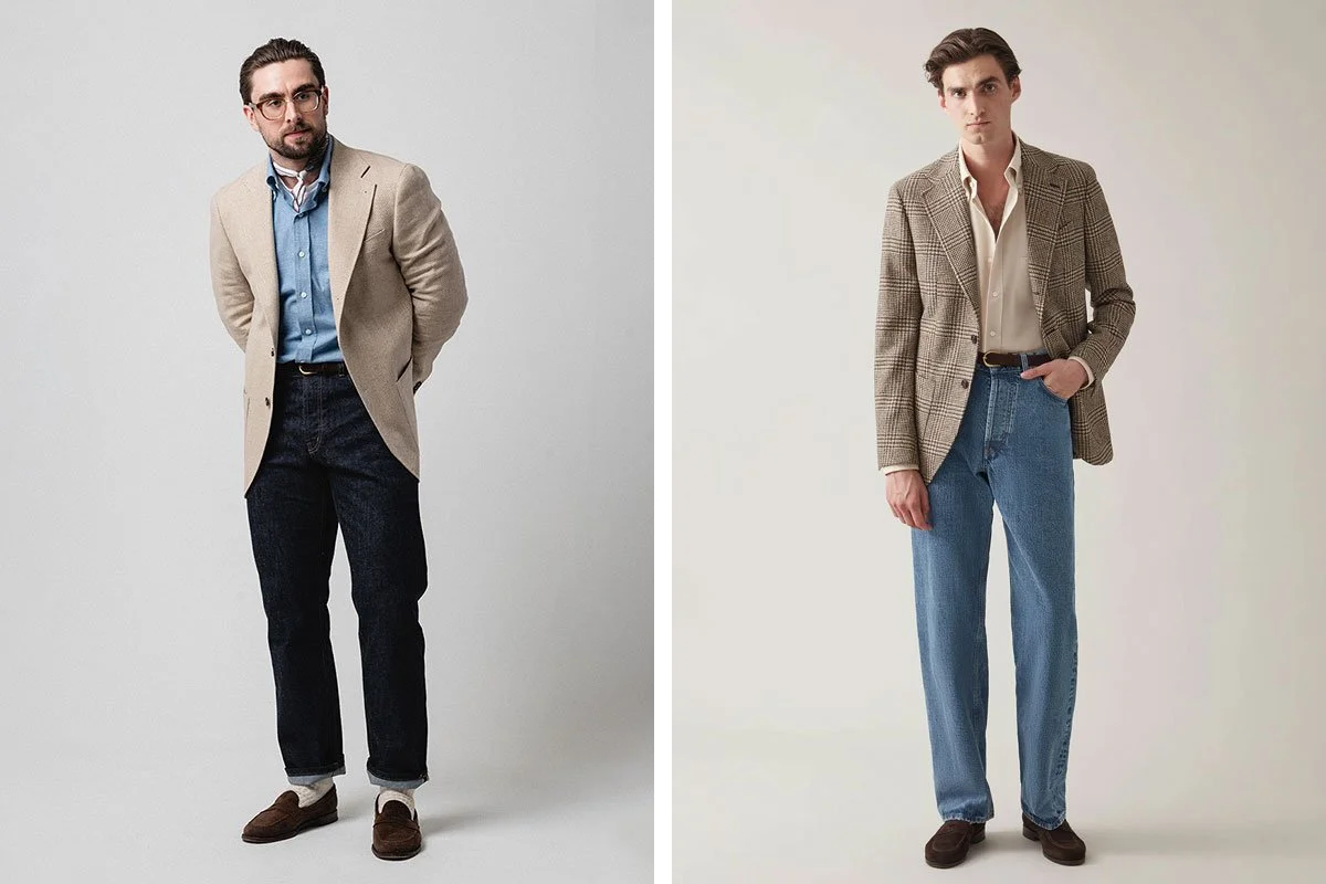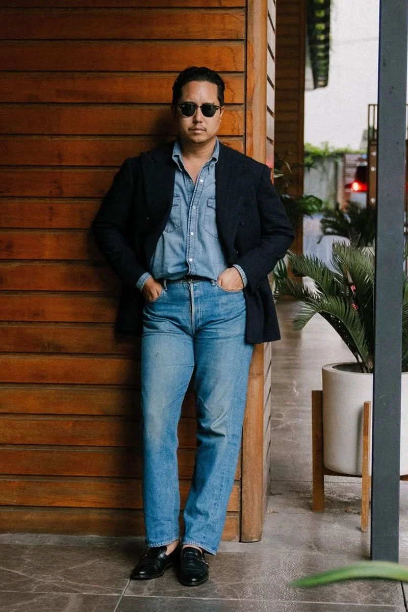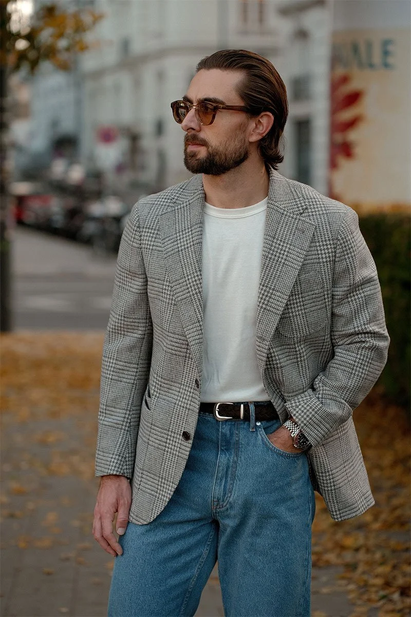 Washed blue jeans are in my opinion, the most casual pair of trousers that still work really well with tailoring. (Some might argue that fatigues hold that title, but I disagree.) Jacket or no jacket, they always work. They’re almost bulletproof when it comes to pairing with other clothes. The only mistake you can make is choosing a jacket or shirt that is too elegant or too formal, as that would split your outfit in half - very formal from the waist up, while below the belt, it would look like you forgot to change your trousers.