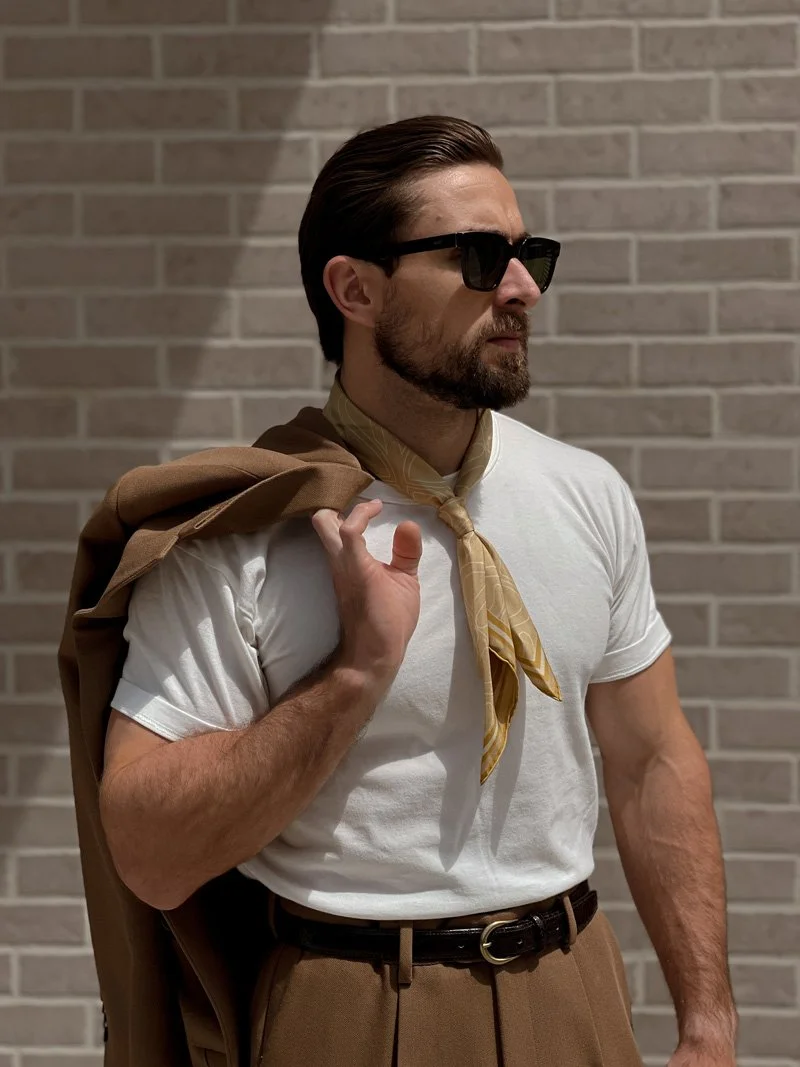 Finding ways to wear tailored trousers very casual. And grey is one of the colours I don’t wear often but it works perfectly for neutral looks like this one. Paired with ecru corduroy overshirt, beautiful knitted white polo and white deck sneakers make this shade of grey stand out even more.